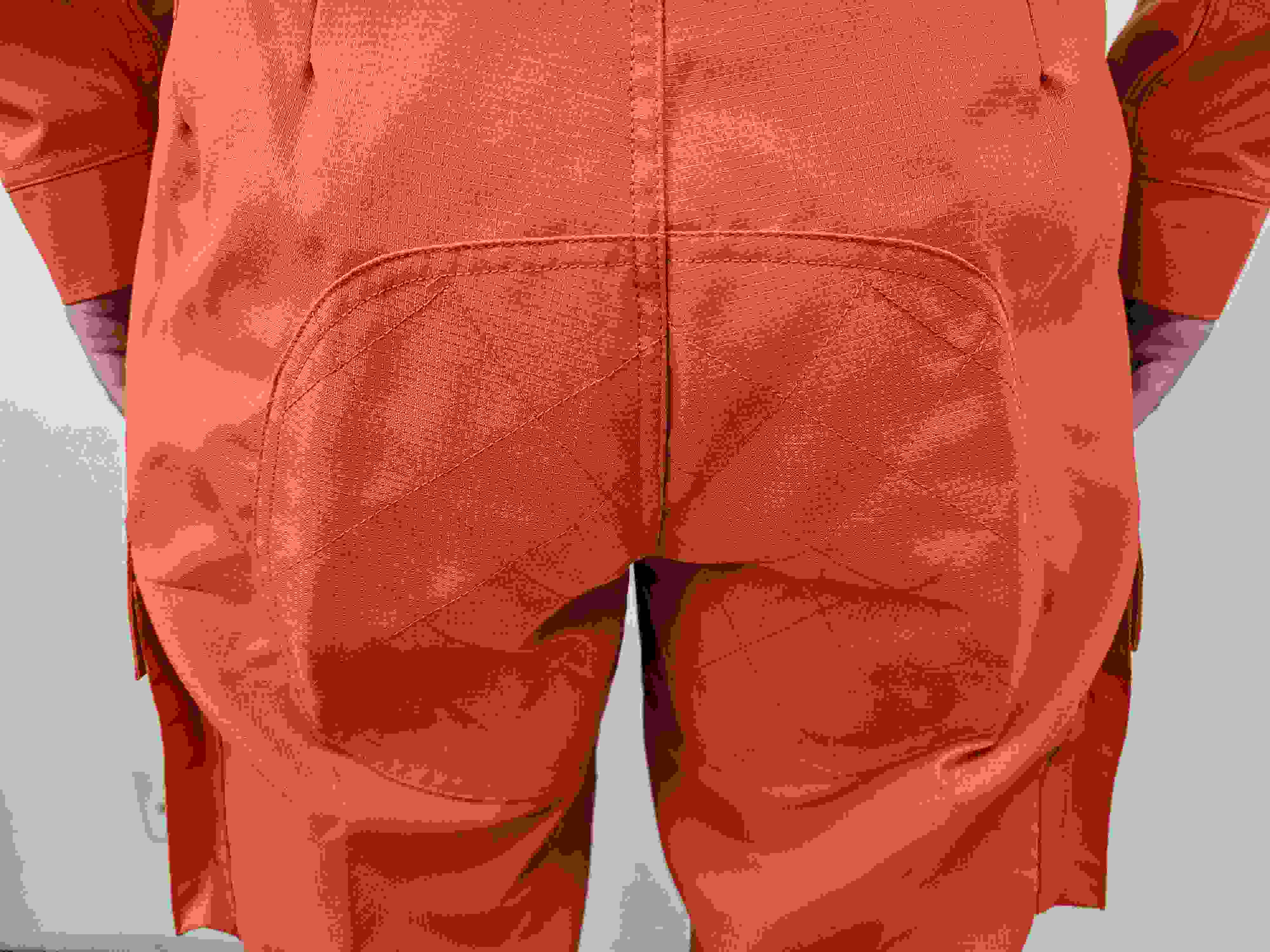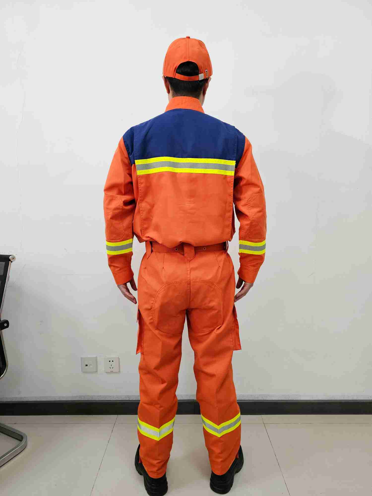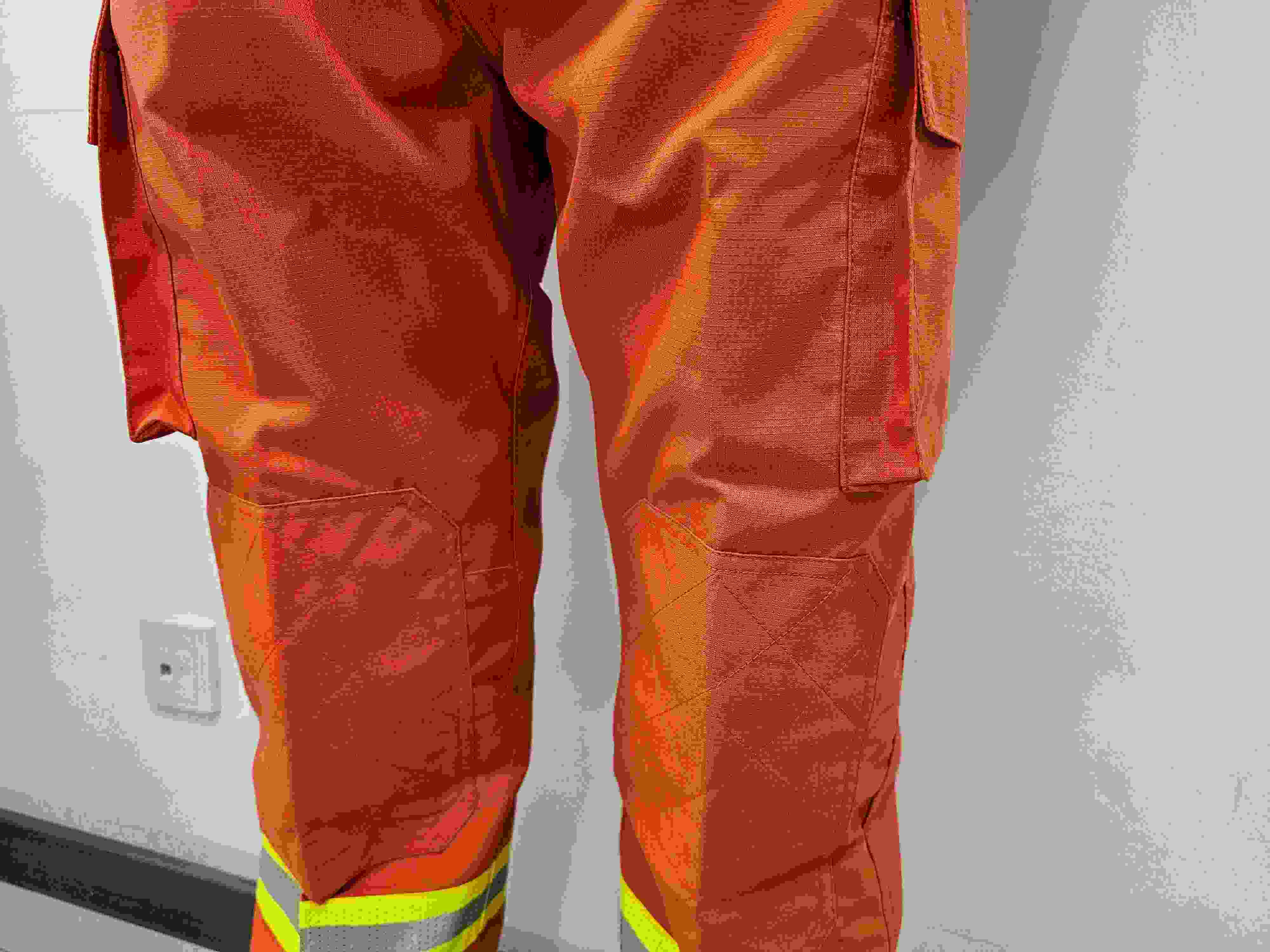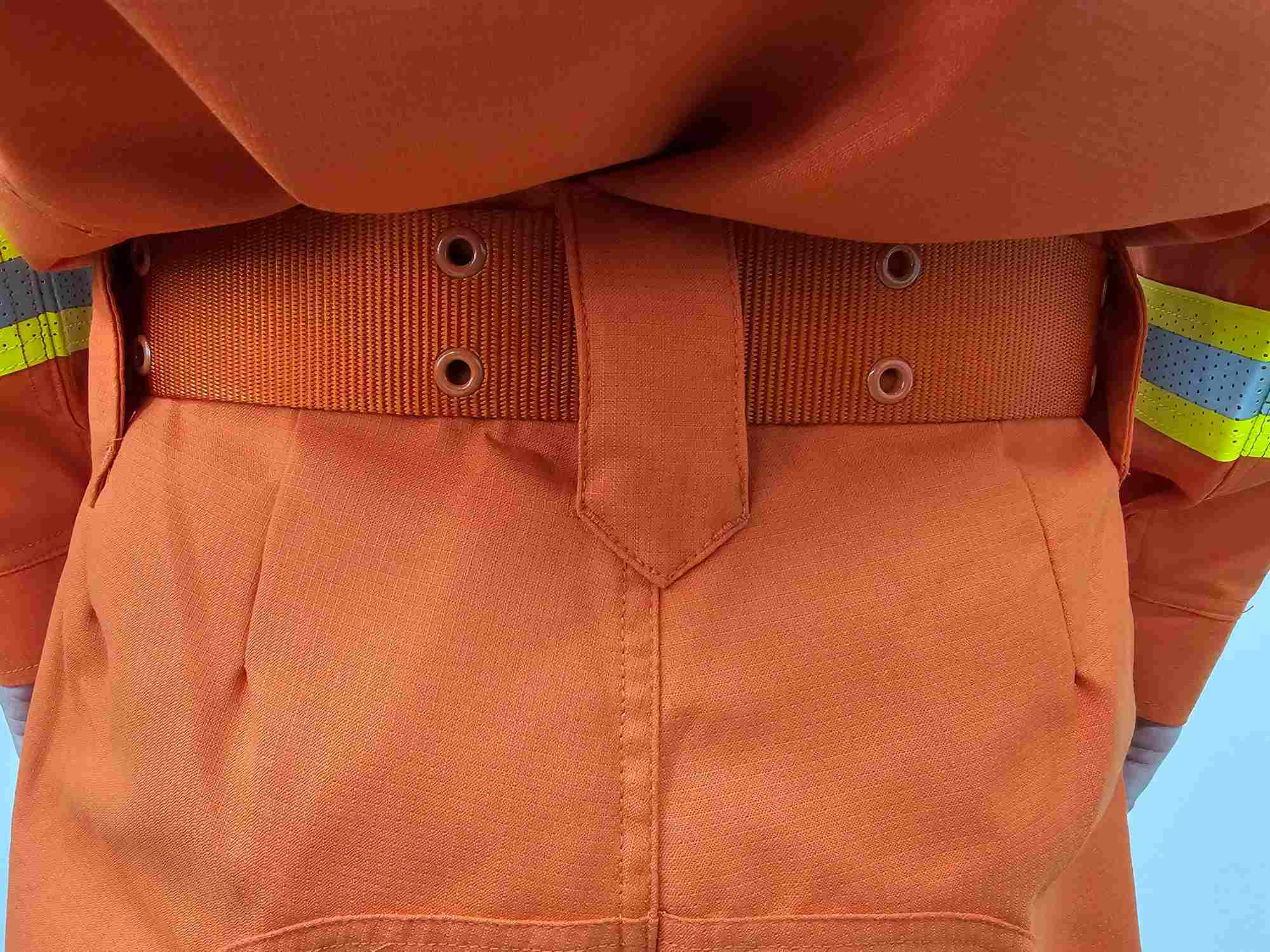 采用雙層結構織法,表層面料采用芳綸橘紅面料,內層為芳綸與舒適性纖維天絲混紡,具有外防內吸、具備彈性、防靜電、阻燃、輕便、抗拉力強等性能。單位面積質量207.14g/m2,提供第三方出具的檢測報告,每套面料有面料防偽標識。
